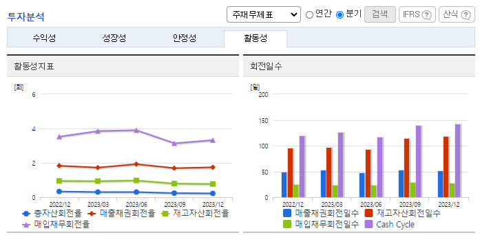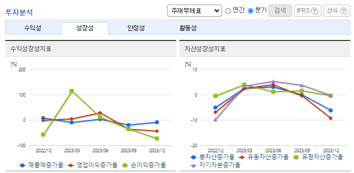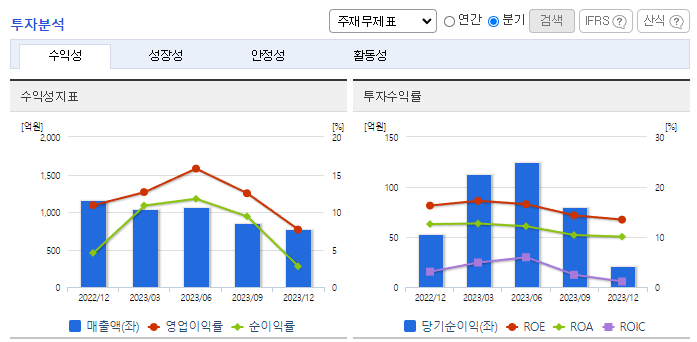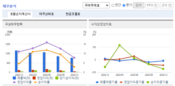 -2023년 9월 전년동기 대비 연결기준 매출액은 3.6% 감소, 영업이익은 8.8% 증가, 당기순이익은 0.7% 증가. 동사의 기어 및 동력 전달장치 제조 사업부문의 링크아세이, 상품 매출 등이 전년동기 대비 감소하며 전체적인 매출액은 소폭 감소하였음. 매출액이 소폭 감소했지만 원가율이 개선되고 각종 비용 절감으로 인해 영업이익은 증가하였으며 동사는 전공정 수직계열화로 원가경쟁력을 확보하고 있음.