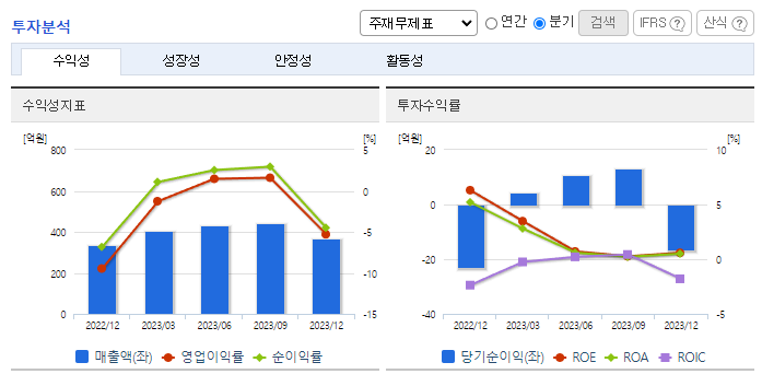 -2023년 9월 전년동기 대비 별도기준 매출액은 24.4% 감소, 영업이익은 94.8% 감소, 당기순이익은 80.6% 감소. 디스플레이 핵심 반도체인 Driver IC의 후공정인 골드범프, 웨이퍼테스트, 조립, 최종테스트 구조에서 장기 성장성을 확보하기 위해 노력 중. 2022년 12월 System IC TEST 생산라인을 구축하였고, COF 및 골드범프의 생산 감축 및 가동률 방어를 진행한 상황이며 고부가 디스플레이를 활용 중.
