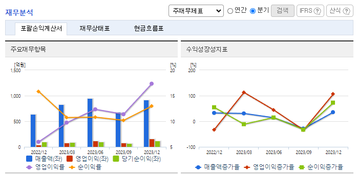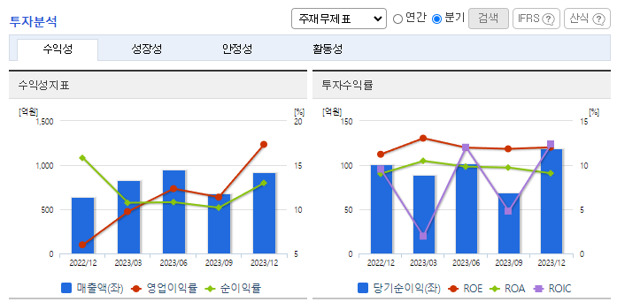 -2023년 9월 전년동기 대비 연결기준 매출액은 33% 증가, 영업이익은 14.2% 증가, 당기순이익은 17.4% 증가. 실적 변동성이 높지 않은 경상정비 사업의 특성상 전년동기와 같은 안정적인 흐름을 유지하고 있으며, 전년동기 대비 해외설비 부문의 매출이 크게 증가함. 금화정수의 실적이 23년 3분기에 반영되며 수처리 부문이 매출부문 상위를 구성함. 금화정수는 국내 원자력 발전 수처리 부문에서 높은 기술력으로 호평받고 있음.