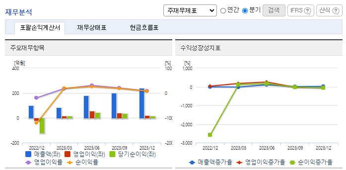 -2023년 9월 전년동기 대비 별도기준 매출액은 42.2% 증가, 영업이익 흑자전환, 당기순이익 흑자전환. 건설공사 사업부문에서 국내 매출이 발생하며 매출이 전분기 대비 100% 상승함. 우호적인 영업환경에서 수익성이 강화되고 있음. 2023년 5월 한국전력이 국가 에너지 확보 확립을 위한 서해안 해상 초고압직류송전(HVDC) 기간망 구축 계획을 밝히는 등 영업 환경이 우호적.
