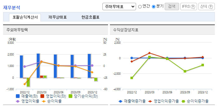 -2023년 9월 전년동기 대비 연결기준 매출액은 0.4% 감소, 영업이익 흑자전환, 당기순이익 흑자전환. 매출은 전년대비 거의 변동 없으나 매출원가가 5.1% 감소하는 등 원가율이 개선되었으며 판관비의 절감 노력에 따라 영업이익이 흑자전환함. 동사는 다른 제약사의 의약품을 들여와 판매하는 상품에 대한 매출의존도(약 70~80% 수준)가 높은 편으로 매출에 영향을 주고 있음.