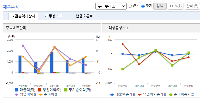 -2023년 9월 전년동기 대비 연결기준 매출액은 12.4% 감소, 영업이익 적자전환, 당기순이익 적자전환. 국내외 대형 거래선과의 지속적인 거래 관계를 유지 중. 일부 거래선의 내부적인 요인으로 인하여 신규 프로젝트가 지연됨. 동사의 종속회사 케이퓨처테크(주)는 XR(확장현실), 로봇 통합 플랫폼, 네트워크 솔루션 등 신사업을 추진하며 관련 시장을 적극 공략하고자 함.