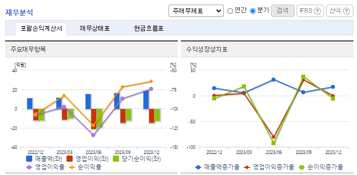 -2023년 9월 전년동기 대비 연결기준 매출액은 70.3% 증가, 영업손실은 34.4% 증가, 당기순손실은 22.8% 증가. XR 교육 훈련 사업의 수주 확대로 매출은 증가하였으나, 게임 개발 관련 외주용역비 및 연구개발비 등 비용의 증가로 영업손실 지속. 2024년 상반기 메타와 공동개발 중인 VR FPS게임 스트라이크러시 출시를 시작으로 이스케이프 룸 온라인 정식 버전 출시를 계획하고 있음.
