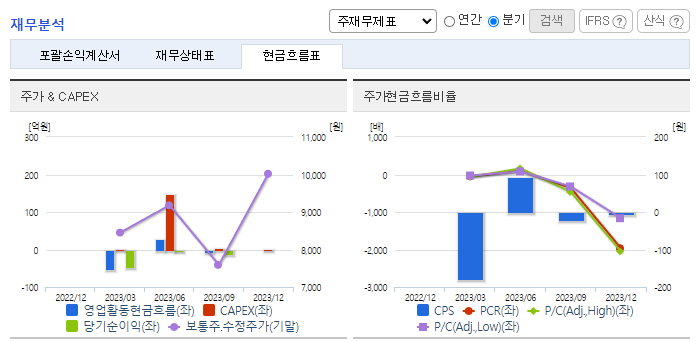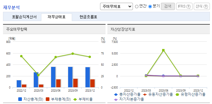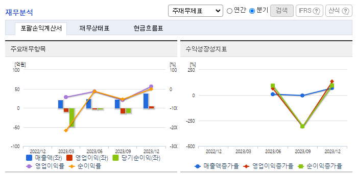 -2023년 9월 전년동기 대비 별도기준 매출액은 4.5% 증가, 영업손실은 233.5% 증가, 당기순손실은 2661.8% 증가. 핵심 사업분야인 마이크로 디스플레이 Panel & SoC 매출은 전년 3분기 대비 28.6% 증가하였음. 하지만 판관비가 급격히 증가하여 적자폭이 증가함 스펙 합병 이후 매출 성장세 지속 중이며 목표 시장 분야별로 다양한 글로벌 리딩 업체와의 협력을 통해 매출을 확대해가고 있음.