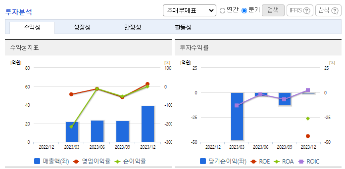 -2023년 9월 전년동기 대비 별도기준 매출액은 4.5% 증가, 영업손실은 233.5% 증가, 당기순손실은 2661.8% 증가. 핵심 사업분야인 마이크로 디스플레이 Panel & SoC 매출은 전년 3분기 대비 28.6% 증가하였음. 하지만 판관비가 급격히 증가하여 적자폭이 증가함 스펙 합병 이후 매출 성장세 지속 중이며 목표 시장 분야별로 다양한 글로벌 리딩 업체와의 협력을 통해 매출을 확대해가고 있음.