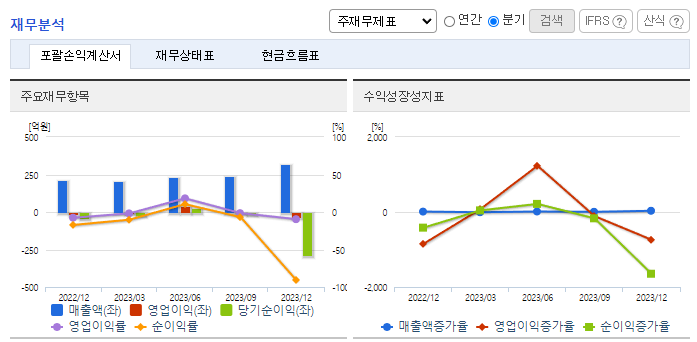 -2023년 9월 전년동기 대비 연결기준 매출액은 23.2% 증가, 영업이익은 1231.3% 증가, 당기순손실은 65.9% 감소. 알뜰폰 가입자 수 증가 등 MVNO부문의 선전 영향으로 전년동기 대비 양호한 외형 기록하였으며, 수익성 또한 크게 개선된 모습을 시현하였음. 기대를 가졌던 스마트그리드부문의 경우 기대했던 것만큼의 성과를 나타내지 못하고 있는 점이 아쉬운 상황.