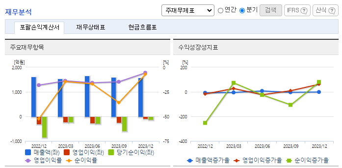 -2023년 9월 전년동기 대비 연결기준 매출액은 6.7% 감소, 영업손실은 2.3% 증가, 당기순손실은 11.7% 감소. 비타민류, 화장품 등 매출이 감소하였으나 인건비 증가 등 비용 발생으로 영업손실이 증가함. 매출액 대비 연구개발비 투자현황은 일동바이오사이언스 8.5%, 루 2.7%, 일동제약 18.9% 등이며 당뇨병치료제, 안질환치료제, 코로나치료제 등을 연구하고 있음.