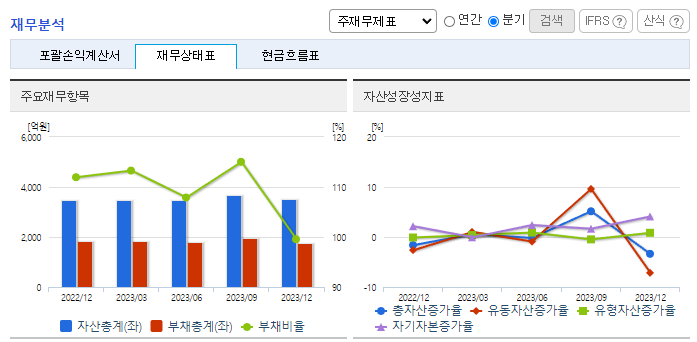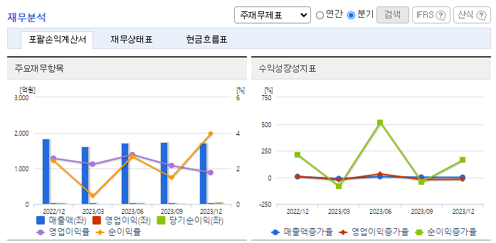 -2023년 9월 전년동기 대비 연결기준 매출액은 10.2% 감소, 영업이익은 8.6% 감소, 당기순이익은 20.2% 증가. 핵심 사업부문인 아스팔트상품부문을 포함한 사업 전 부문의 실적이 부진한 상황이며, 원가율 하락에도 불구하고 수익성 또한 하락한 모습. 향후 정부정책에 맞춰 친환경 신제품을 지속적으로 개발하고, 신규시장 개척에 역량을 집중하여 실적 개선 도모 중.