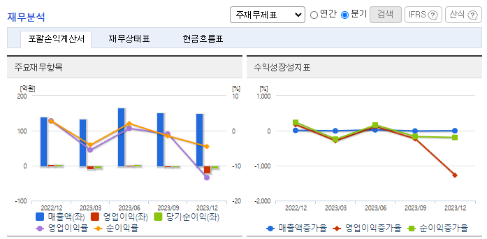 -2023년 9월 전년동기 대비 연결기준 매출액은 33.9% 증가, 영업손실은 81.5% 감소, 당기순손실은 84.4% 감소. 2022년에는 차량반도체 수급 이슈 등으로 일시적 매출감소가 발생하였으나, 최근 런칭한 자체 커머스 브랜드 '공임비교' 등 신규 투자를 다방면으로 계획하고 있음. 현대/기아차와의 제휴를 통해 신차 출시 전 설계 데이터를 제공받아 관련 자동차 용품을 선 개발하고 있어 경쟁업체 대비 유리한 위치를 점하고 있음.