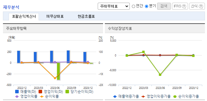 -2023년 9월 전년동기 대비 연결기준 매출액은 5.8% 증가, 영업이익은 16.5% 증가, 당기순이익 적자전환. 내과품목중심의 영업기반으로 제품 포트폴리오를 정비하고 신약 개발에 투자하면서 매출이 점진적으로 성장하고 있음. SK케미칼과 스카이조스터주 공동판매 협약을 체결하여 영업하고 있고 갈더마코리아의 오리지널 제품 독점 판매 계약을 체결, 성장가치가 높은 클리닉 시장에서 경쟁력을 더욱 강화하고 있음.