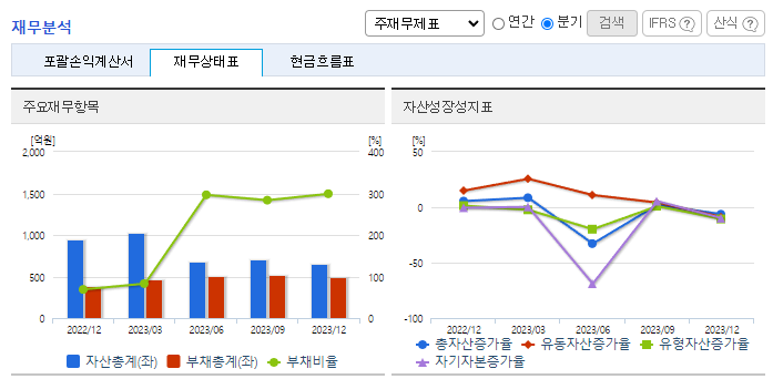 -2023년 9월 전년동기 대비 연결기준 매출액은 5.8% 증가, 영업이익은 16.5% 증가, 당기순이익 적자전환. 내과품목중심의 영업기반으로 제품 포트폴리오를 정비하고 신약 개발에 투자하면서 매출이 점진적으로 성장하고 있음. SK케미칼과 스카이조스터주 공동판매 협약을 체결하여 영업하고 있고 갈더마코리아의 오리지널 제품 독점 판매 계약을 체결, 성장가치가 높은 클리닉 시장에서 경쟁력을 더욱 강화하고 있음.
