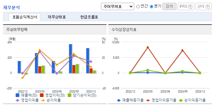 -2023년 9월 전년동기 대비 별도기준 매출액은 130.2% 증가, 영업이익 흑자전환, 당기순이익 흑자전환. 동사는 전년 동기 대비하여 큰 폭의 매출 성장을 보임. 또한 원가율은 전년 동기와 비슷한 수준으로 원가율의 큰 개선이 나타남. 이에 따라 영업이익과 당기순이익 흑자전환에 성공함. 조달 리스크를 방지하고 수요 급증 시 원활한 공급을 위해, 외주 생산처 및 테스트 업체를 제품군별로 이원화, 삼원화 중임.