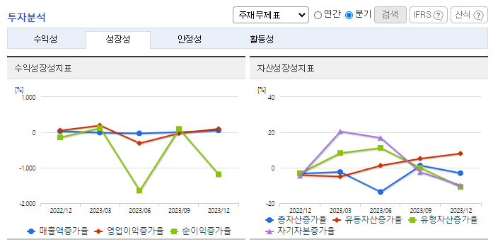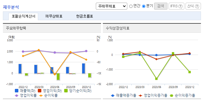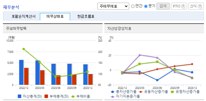 -2023년 9월 전년동기 대비 연결기준 매출액은 3.1% 증가, 영업손실은 36.8% 감소, 당기순손실은 26.9% 감소. 2023.5.12 ㈜이아이디의 사실상 업무집행지시자의 대규모 횡령·배임혐의설에 대해 조회공시와 함께 매매거래가 정지되었음. 2023.05.31 ㈜이아이디의 ‘횡령·배임 혐의 발생’ 사실이 공시되어 유가증권시장 상장규정 제49조에 따라 동사가 기업심사위원회 심의대상에 해당되는지 여부를 결정할 예정임.