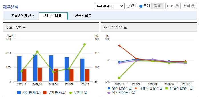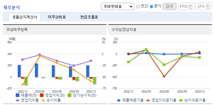 -2023년 9월 전년동기 대비 연결기준 매출액은 7.7% 감소, 영업손실은 129.4% 증가, 당기순손실은 0.9% 증가. 매출부문 중 플랫폼 매출은 13.59% 증가했으나, 마케팅 매출부문은 27.64% 감소와 함께 전반적으로 매출이 감소해 전체 외형 성장에 부담을 줌. '바비톡'은 리뉴얼 이후 추가된 투표기능 등을 소개하는 마케팅 콘텐츠를 제작하여 SNS 채널에 집중 홍보하며 인플루언서들을 이용한 마케팅 활동을 전개 중임.