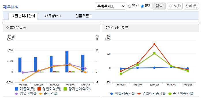 -2023년 9월 전년동기 대비 연결기준 매출액은 13.3% 감소, 영업이익은 39.6% 감소, 당기순이익은 34.1% 감소. 전년동기 대비 중국 LED업체들의 발주량이 30% 이하로 급감하였으며 중국 정부의 지원 축소로 인한 해외 수출부문에서의 매출액 감소. LG 디스플레이 및 LG 전자에 대한 영업확대 및 점유율 향상을 목표로 하고 있으며, 중국 및 일본 등 매출처 다변화를 목표로 영업 활동을 진행 중.