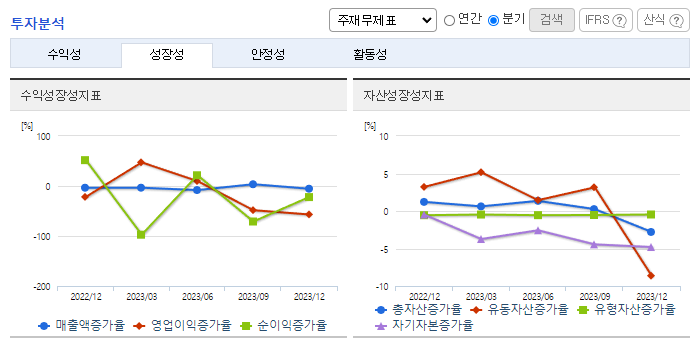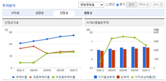-2023년 12월 전년동기 대비 연결기준 매출액은 10.9% 감소, 영업손실은 7.1% 감소, 당기순손실은 59.5% 증가. 장기차입금의 증가로 인해 부채비율이 전기 대비 33.5% p 증가하였음. 부채비율 감소를 위해 대구백화점 본점 부동산 매각을 진행하고 있음. 하나은행 외 14개 금융기관에서 891억을 장기차입하였으며, 하나은행 외 15개 새마을금고에 유동성장기부채 508억을 상환하였음.