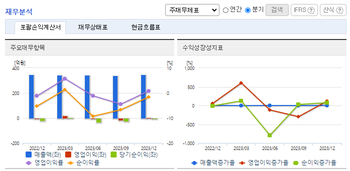 -2023년 12월 전년동기 대비 연결기준 매출액은 1.2% 감소, 영업이익 흑자전환 영업이익은 판관비 감소로 인해 흑자전환했으며, 영업 외 비용 증가로 당기순손실 53억 원을 기록했음. 신제품 도입과 주력제품에 대한 영업 마케팅 활동 강화로 매출 증대를 목표로 하며, 미국과 유럽 출시 목표인 전립선 비대증 및 탈모 치료 개량신약에 집중해 미래 캐시카우 발굴에 속도를 낼 계획임.