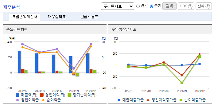 -2023년 9월 전년동기 대비 연결기준 매출액은 1.5% 감소, 영업이익은 91.2% 감소, 당기순이익 적자전환. 자동차부품소재부문에선 기존 영위하던 사업영역에 신규로 Hook&Loop 제품을 라인업에 추가함에 따라 다양한 제품 라인업을 구축함. 플루오린코리아의 주요 생산제품인 F2가스는 반도체 미세공정 고도화가 진행됨에 따라 도입 범위가 점차 확대되고 있어 향후 폭발적인 시장 규모의 확대가 예상됨.