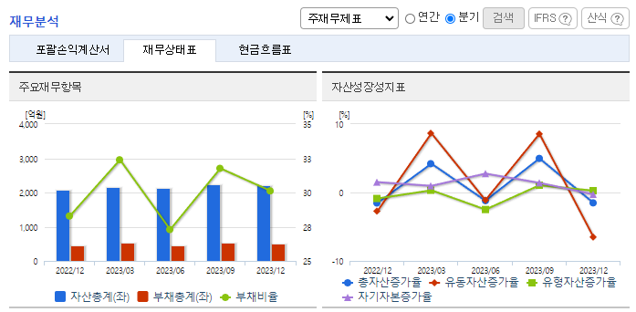 -2023년 9월 전년동기 대비 연결기준 매출액은 7.9% 증가, 영업이익은 19.2% 증가, 당기순이익은 17.4% 증가. 전년도 대비 국내영업에서 매출이 약 95.9억(8.0%) 증가하였고 해외영업에서 약 1.5억(3.7%) 증가 중국 내수시장 확대를 위해 현재 상해와 북경 중심의 상권 확보에 주력하고 있으며, 현지 원부자재 조달과 생산의 Quality 향상, 원가 절감 등을 위하여 현지 법인과의 유기적인 협조 체제를 지속.