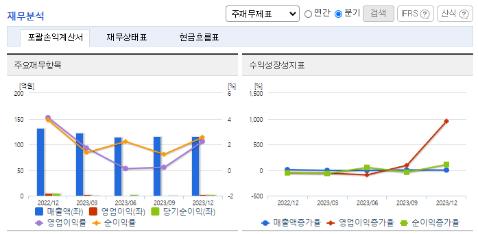 -2023년 9월 전년동기 대비 별도기준 매출액은 0.2% 감소, 영업이익은 91% 감소, 당기순이익은 78% 감소. 매출은 전년동기대비 거의 변동 없으나 식품첨가물의 원재료가 5.9%, 원료의약품의 원재료가 6.58% 증가하는 등 원가가 증가하여 영업이익은 크게 감소함. 2023년 3분기말 주요 매출처는 몬스터에너지코리아, 엘지생활건강, 태극제약, 종근당 등이 있음.