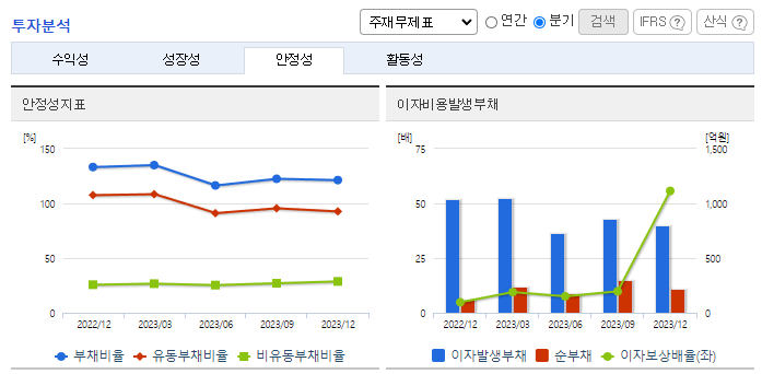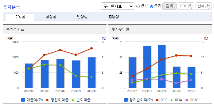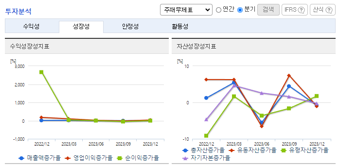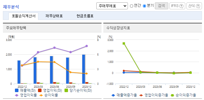 -2023년 12월 전년동기 대비 연결기준 매출액은 33.1% 증가, 영업이익은 231.5% 증가, 당기순이익은 186.6% 증가. 내수 및 유럽시장의 선전으로 양호한 수준의 외형 기록하였으며, 염료 등 원부자재 가격의 안정 및 비용 절감 영향으로 수익성은 크게 상승한 모습. 고부가가치 제품 판매 확대를 통한 수익성 추가 개선 노력 중. 또한 신규 거래처 확대를 통한 외형 확대 및 거래처 다변화 시도 중.