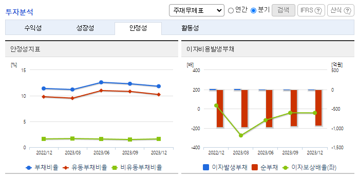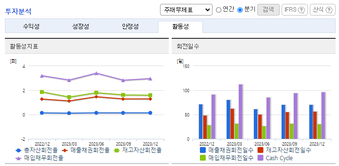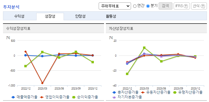 -2023년 9월 전년동기 대비 연결기준 매출액은 2.8% 증가, 영업손실은 93.2% 증가, 당기순이익은 51.6% 감소. 외형은 전년도 수준을 유지하고 있으나, 판관비의 수출경비 및 판매보증충당부채전입액의 증가로 영업손실의 적자폭은 확대됨. 판매 감소 극복 및 이익 극대화를 위하여 지속적인 신제품 개발 및 품질 경쟁력 향상을 통하여 신제품을 적극 수주하여 수익성 향상에 노력할 것임.