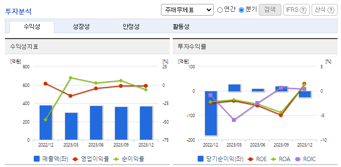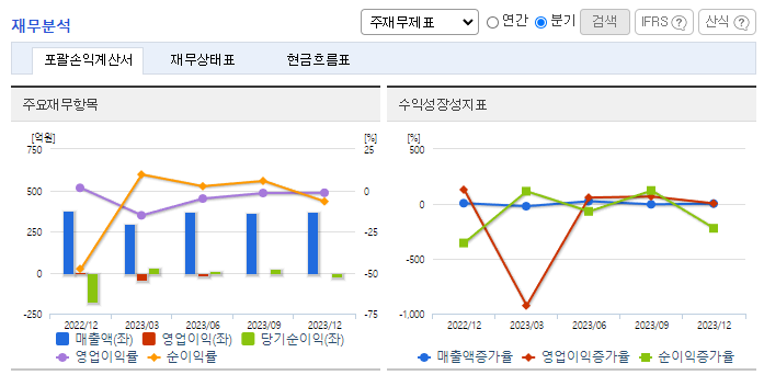 -2023년 9월 전년동기 대비 연결기준 매출액은 2.8% 증가, 영업손실은 93.2% 증가, 당기순이익은 51.6% 감소. 외형은 전년도 수준을 유지하고 있으나, 판관비의 수출경비 및 판매보증충당부채전입액의 증가로 영업손실의 적자폭은 확대됨. 판매 감소 극복 및 이익 극대화를 위하여 지속적인 신제품 개발 및 품질 경쟁력 향상을 통하여 신제품을 적극 수주하여 수익성 향상에 노력할 것임.
