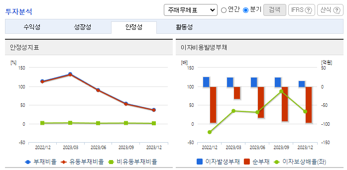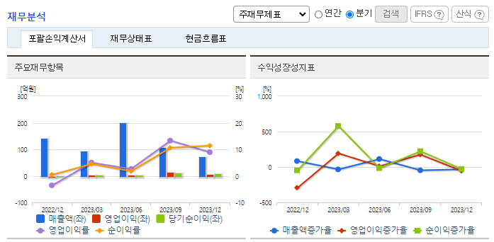 -2023년 12월 전년동기 대비 별도기준 매출액은 14.5% 증가, 영업이익은 478.9% 증가, 당기순이익은 234% 증가. 동사는 100% 외주 생산하여 원재료 가격 등의 영향을 받지 않음. 이번 수익성 개선은 매출 규모가 큰 폭으로 늘어난 것이 배경으로 보임. 동사의 당기순이익은 인건비 및 원가율의 감소에 따라 전기 대비 19억 증가한 27억 원을 기록하고 있음.