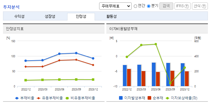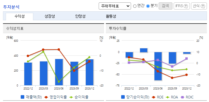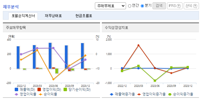 -2023년 12월 전년동기 대비 연결기준 매출액은 6.9% 증가, 영업이익 적자전환. 이번 실적 부진은 새롭게 출시한 안구건조증 치료제(레바아이와 레바케이)가 성장통을 겪은 영향. 출시 초기 제품을 시장에 안작시키는 과정에서 판관비 증가. 안과 질환 기반 신약 파이프라인 개발에 힘쓰고 있음. 지난해는 아이진과 손잡고 당뇨망막증 치료 신약 '이지 미로틴' 개발 나섰음.
