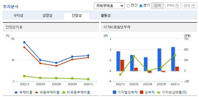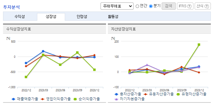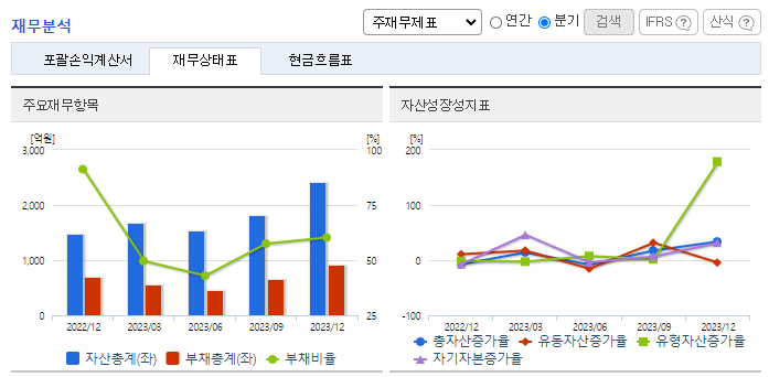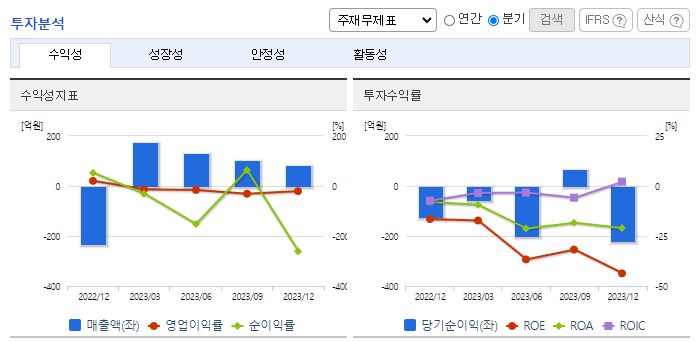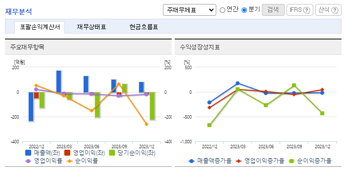 -2023년 12월 전년동기 대비 연결기준 매출액은 23.4% 증가, 영업손실은 110.5% 증가, 당기순손실은 228.7% 증가. 당기 영업손익은 고정비 부담 증가 및 영업상황 악화로 인해 영업손실 9,321백만 원으로 전기대비 4,893백만 원이 증가함. 동사는 지속적으로 고부가가치 제품군의 론칭에 힘써 매출액의 증가와 더불어 생산방식의 개선, 신규 매입처 발굴을 통해 원가 절감을 추구하고자 함.