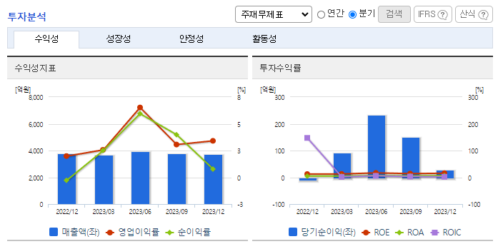 -2023년 12월 전년동기 대비 연결기준 매출액은 10.2% 증가, 영업이익은 60.4% 증가, 당기순이익은 41.5% 증가. 반도체 등 부품 수급 차질 해소, 친환경차 및 SUV 판매호조, 전년도 기저효과 등에 따라 전년 대비 외형 성장에 성공. 매출 증가와 원가율 개선에 힘입어 영업이익도 대폭 증가. 부가가치가 높은 SUV 및 전기차 신규 수주 등 사업 확대를 추진 중.