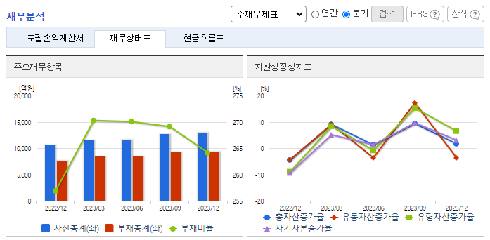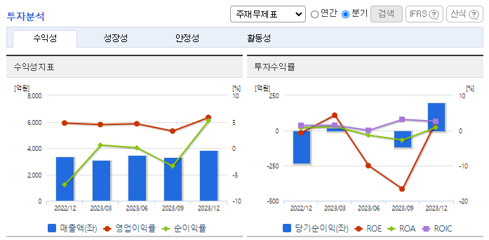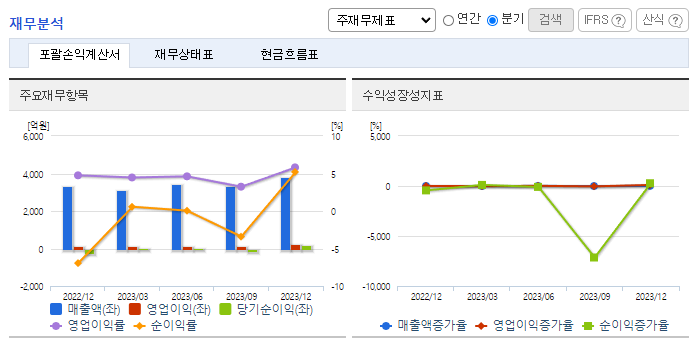 -2023년 12월 전년동기 대비 연결기준 매출액은 11.5% 증가, 영업이익은 18.4% 증가, 당기순이익 흑자전환. 자동차산업의 활성화로 고객사 생산량 증대로 이어져 외형은 확대됨. 해외법인 투자 관련 비용증가 등에도 영업이익은 증가세를 유지함. 올해 E-GMP 전기차용 배터리 모듈 팩 제조 사업 신규 진출로 신설 법인을 통해 향후 자체 설계 및 개발로 사업 영역 확대도 기대됨.