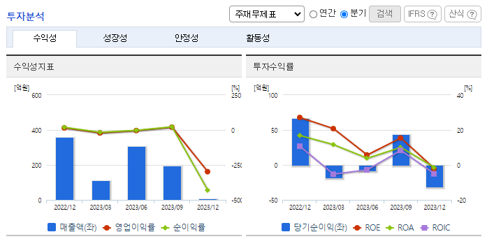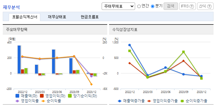 -2023년 12월 전년동기 대비 연결기준 매출액은 24.2% 감소, 영업이익 적자전환, 당기순이익 적자전환. 2023년 반기 기준 드라마 <두뇌공조, KBS>, <낭만닥터 김사부 3, SBS> 2편의 드라마를 방송사에 제공하며 견고한 라인업을 기반으로 실적 유지가 기대됨. 동사는 향후 드라마 IP 소유를 더욱 확대해 나갈 예정이며, 이를 활용해 다양한 부가 사업(One Source, Multi-Use) 진행 계획.