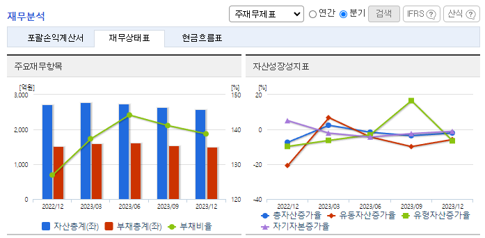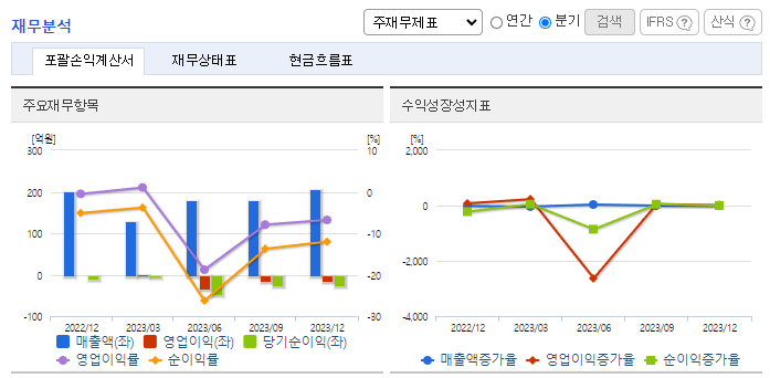 -2023년 12월 전년동기 대비 연결기준 매출액은 29% 감소, 영업이익 적자전환, 당기순이익 적자전환. 동사의 주요 수출지역인 미국의 내수 경기가 기대에 미치지 못함으로써 미국지역으로의 매출이 감소하면서 전체 매출액이 29% 감소하는 결과를 맞음. 영업이익은 판매관리비의 고정비 비중이 증가함에 따라 1억 6000만 원의 적자를 나타내었으며 법인세차감전순이익은 지분법손실의 증가로 96억 원의 적자를 냄.