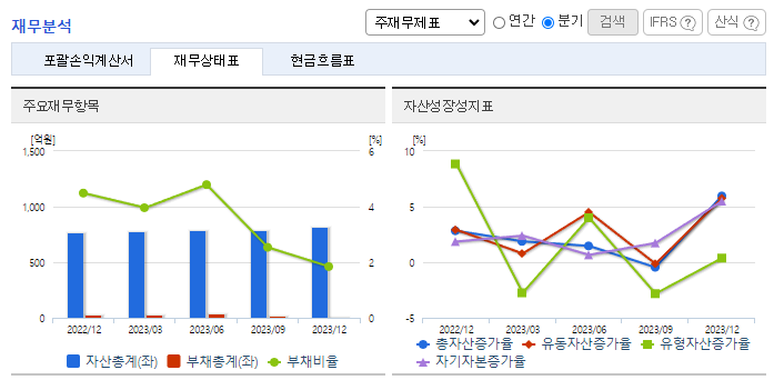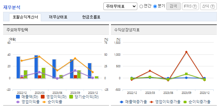 -2023년 12월 전년동기 대비 별도기준 매출액은 26.8% 감소, 영업이익은 46.5% 감소, 당기순이익은 23.3% 감소. 동사는 매출이 20% 넘게 감소하면서, 매출원가가 큰 폭으로 감소했음에도 불구하고, 영업이익이 절반 가까이 줄어듦. 동사의 매출원가 감소 주요 요인은 전기 코로나19 장기화에 따른 안전재고 확보 과정에서 증가한 재고자산의 평가손실충당금 설정 영향임.
