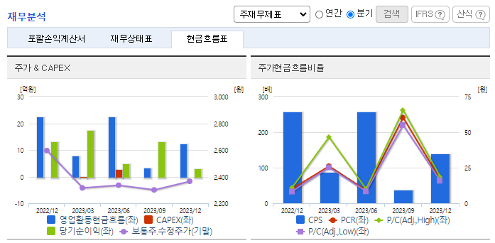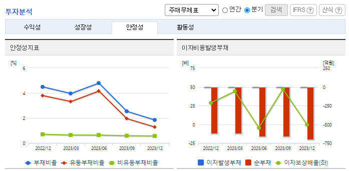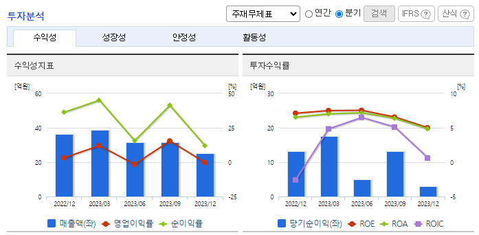 -2023년 12월 전년동기 대비 별도기준 매출액은 26.8% 감소, 영업이익은 46.5% 감소, 당기순이익은 23.3% 감소. 동사는 매출이 20% 넘게 감소하면서, 매출원가가 큰 폭으로 감소했음에도 불구하고, 영업이익이 절반 가까이 줄어듦. 동사의 매출원가 감소 주요 요인은 전기 코로나19 장기화에 따른 안전재고 확보 과정에서 증가한 재고자산의 평가손실충당금 설정 영향임.