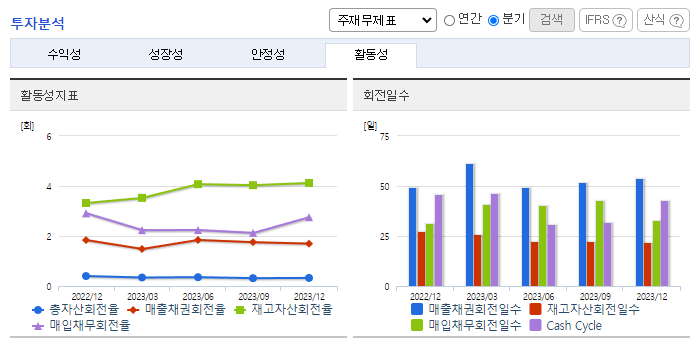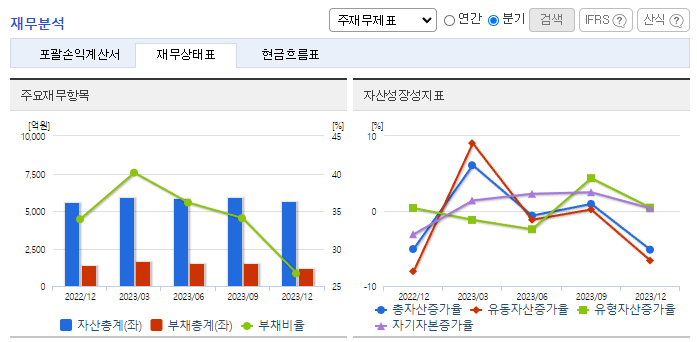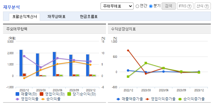 -2023년 12월 전년동기 대비 연결기준 매출액은 5.6% 증가, 영업이익은 50.7% 증가, 당기순이익은 5.1% 감소. 해외 매출 부진에도 불구하고 내수시장 판매가 호조를 보이며 전년 대비 외형 성장에 성공. 매출 증가와 판관비 절감 노력에 힘입어 영업이익 대폭 개 전 생산라인에 걸쳐 작업공정의 표준화 및 합리화 등 종합적인 관리 시스템을 구축하고 품질보증체제를 구축함.