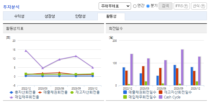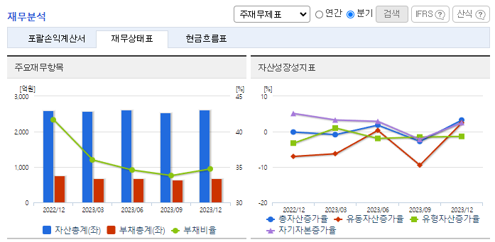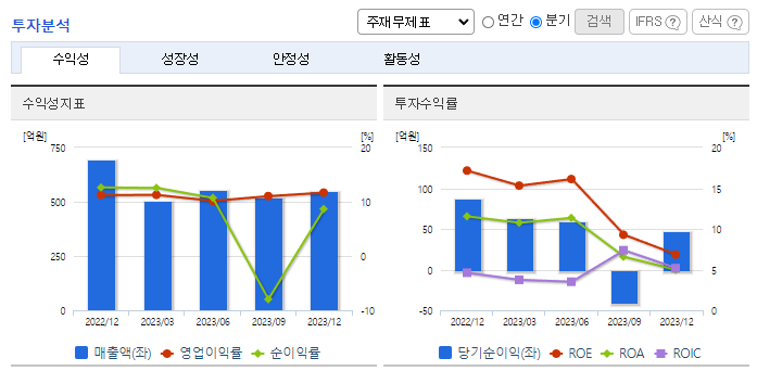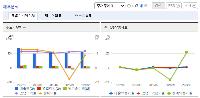-2023년 12월 전년동기 대비 별도기준 매출액은 18.6% 감소, 영업이익은 10.9% 감소, 당기순이익은 55.3% 감소. 거시경제의 불확실성에 따른 업황의 둔화와 이에 따른 업계 내 경쟁 심화로 인해 어려운 경영여건이 지속됨. 운영관리 분야의 예측 경영을 확대하고 디지털 전환과 자동화 기술의 접목을 통해 스마트팩토리의 경쟁력을 한층 더 강화해 나감으로 본업의 경쟁력을 더욱 확고히 할 계획.