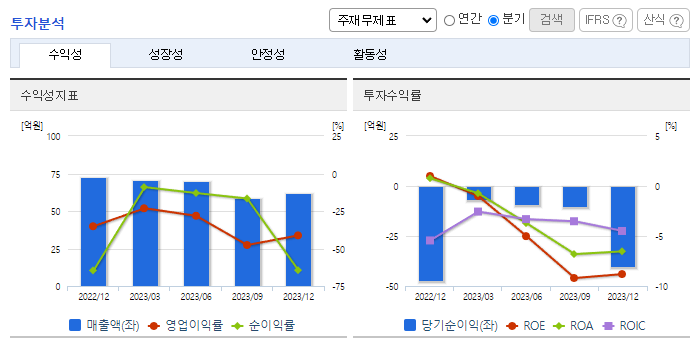 -2023년 연간 매출액은 261억 원으로 33.6% 전년 동기 대비 감소했음. 영업이익은 적자 전환 매출이 전년 대비 30% 이상 줄어든 반면 판매비와 관리비는 오히려 늘었음. 이에 수익성에 부정적 영향을 줬고, 적자 전환했음. 매출구조가 디스플레이 업황과 특정 고객사에 종속됨을 탈피하고자 Pin Foundry 사업부를 출범하고 새로운 매출 파이프라인을 장착하기 위해 노력하고 있음.