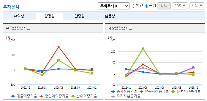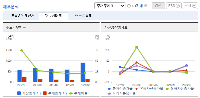 -2023년 12월 전년동기 대비 별도기준 매출액은 9.5% 증가, 영업이익은 9.7% 증가, 당기순이익은 42% 감소. 매출액은 신규사업(프리미엄 피트니스 기구) 매출 증가의 영향으로 2022년 대비 9.49% 증가한 329억, 영업이익은 원가개선 및 이익률 증대의 영향으로 46억 원을 기록하였음. 신규사업 관련 재고자산 취득등으로 인해 현금 및 현금성자산은 전기대비 54억 원 증가.