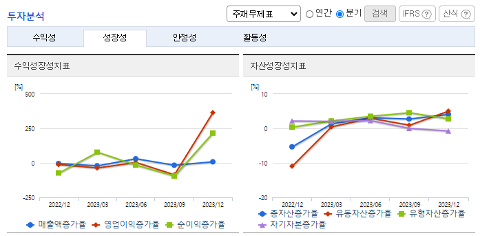 -2023년 12월 전년동기 대비 연결기준 매출액은 16.7% 감소, 영업이익은 59.9% 감소, 당기순이익은 72.3% 감소. 거래처 수주 하락 및 매출 부진으로 전체 외형 축소됨. 주력인 사출성형기 판매 부진이 주 요인. 원재료 감소, 성형시간 단축, 경량화, 품질 향상 등 이점이 있고, 기존 사출성형기 대비 가격이 두 배 이상 높지만, 차량 경량화 관련해 제품 수요가 늘어나고 있음.