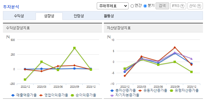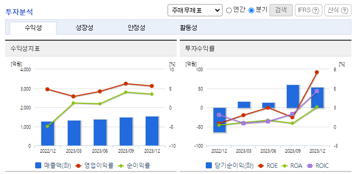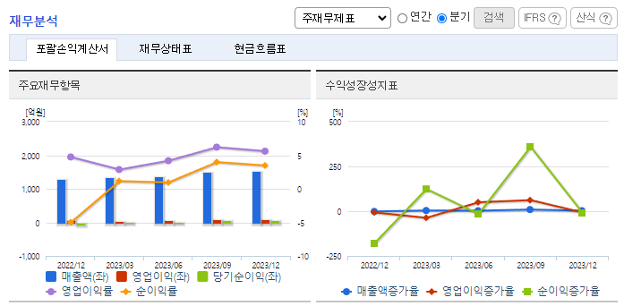 -2023년 12월 전년동기 대비 연결기준 매출액은 17.7% 증가, 영업이익은 95.6% 증가, 당기순이익은 1858.1% 증가. 수출 증가와 중국, 미국 STA 법인의 매출이 증가하면 실적 상승을 견인함. 원자재 가격 상승 등 원가 인상 요인이 있었지만 영업이익 또한 성장세를 유지함. 글로벌 보수용 시장을 중심으로 지속적인 매출을 확대하고 있으며, OE시장에서도 글로벌완성차 납품을 통하여 지속적인 매출성장을 이어가고자 함.