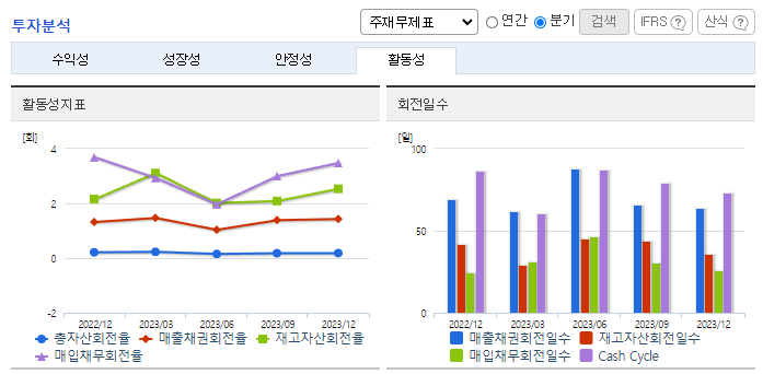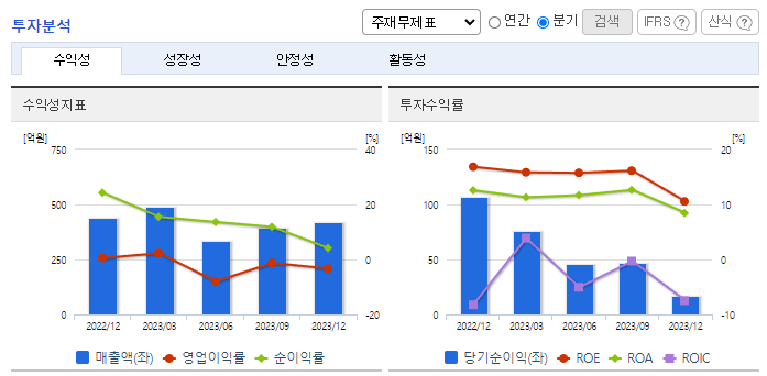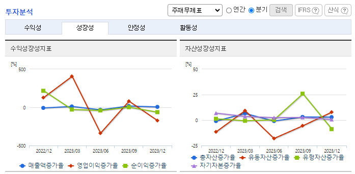 -2023년 12월 전년동기 대비 별도기준 매출액은 14.9% 감소, 영업이익 적자전환, 당기순이익은 29.2% 감소. 경기침체와 단가하락으로 매출액이 감소한 데다, 판관비와 인건비 등이 증가해 영업이익이 적자 전환 했음. 대외적 경제여건과 원가부담을 개선하기 위해 설비자동화로 생산성 향상을 지향하고 있으며, 지속적인 제품의 품질개발과 판매망의 확대를 꾀하고 있음.