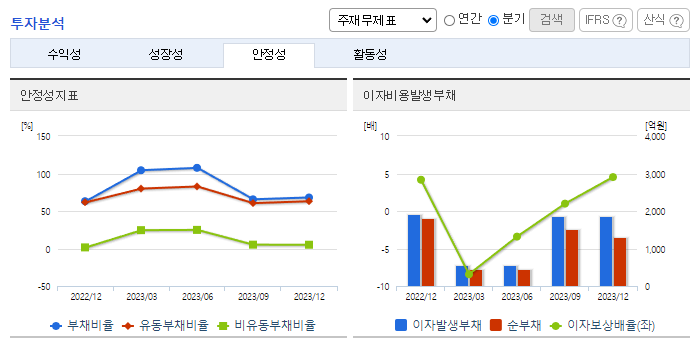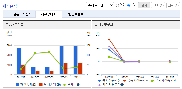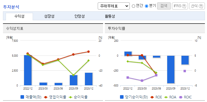 -2023년 말 전년동기 대비 별도기준 매출액은 4% 증가, 영업이익 36.5% 감소, 당기순손실 666억 원으로 적자 전환. 합병에 따른 사업결합으로 연결회사의 매출액은 전년대비 증가했으나, 기준금리 인상에 따른 금융비용 증가와 수요 위축, 업계 경쟁 심화에 따라 수익성이 악화됨. 합병에 따른 손상차손 인식 등 대내외 악재로 인해 영업이익, 당기순이익이 모두 감소함.