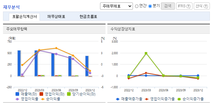 -2023년 12월 전년동기 대비 별도기준 매출액은 8.7% 감소, 영업이익은 59.2% 감소, 당기순이익은 49% 감소. 제품 및 상품 판매가 하락에 따라 매출이 감소했고, 철강경기 침체로 인한 판매단가 감소 및 재고증가로 인해 매출총이익과 영업이익이 각각 34%, 59%씩 감소함. 철강은 대표적인 장치산업으로서 내수경기 회복 및 수출산업의 성장, 중국경제 성장 등에 따른 지속적인 수요가 예상됨.