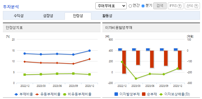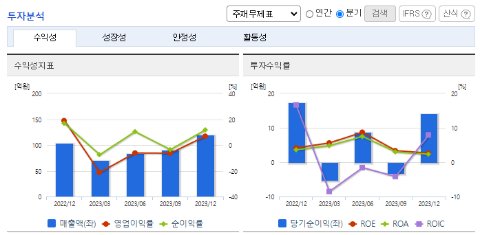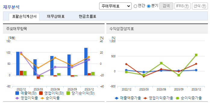 -2023년 12월 전년동기 대비 연결기준 매출액은 21.9% 증가, 영업손실은 310% 증가, 당기순이익은 34.8% 감소. 국내 이동통신사업자와의 긴밀한 파트너십 지속되며 거래를 확대하여 매출이 증가하였으나, 매출원가 비중이 높아져 영업손실폭이 상승함 가상화 부분에 대해선 가상화 파트너십 프로그램(VMware, HP)에 참여하여 상용화를 위한 실질적 검증 단계를 진행하고 있음.