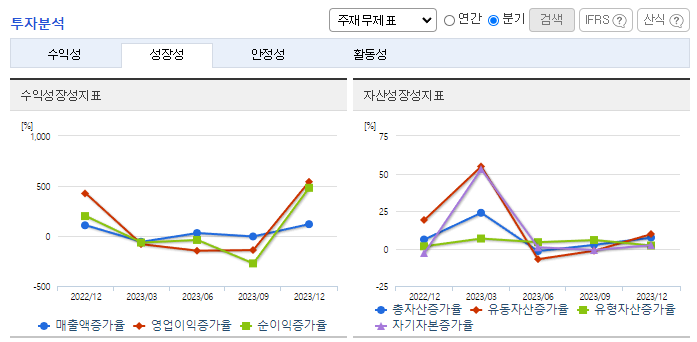 -2023년 12월 전년동기 대비 연결기준 매출액은 9.1% 증가, 영업이익은 53.5% 감소, 당기순이익은 9.2% 감소. 매출액 증가 및 종속법인 (주)샌즈랩의 영업이익과 이익률이 증가하였으나, 다른 영업비용의 증가로 인해 전체 연결 영업이익은 감소함. 동사의 당기순이익은 (주)샌즈랩으로 주식증여를 통한 법인세비용이 일시적으로 증가한 영향으로 전년 대비 감소하였음.