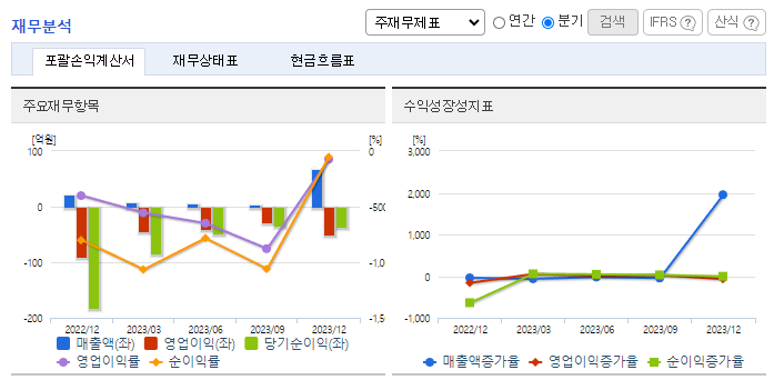 -2023년 12월 전년동기 대비 연결기준 매출액은 77.3% 감소, 영업손실은 95.6% 증가, 당기순손실은 405.7% 증가. 매출은 진단키트 사업의 부진으로 전기 대비 288억 원 감소했고, 영업손실은 매출 감소에 따라 전기 대비 증가했음. SG ID 서비스를 해외와 국내 제약사에 서비스를 제공한 경험을 가지고 있으며, 최근에는 Global Catalog 회사들과의 협의를 통해 본격적인 서비스 출시를 진행할 계획임.