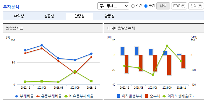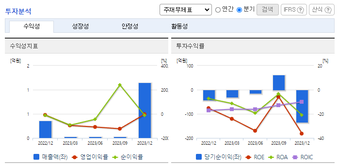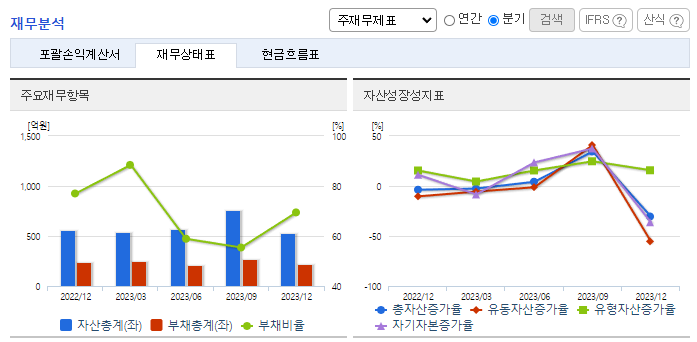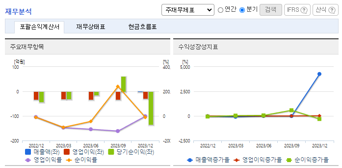 -2023년 12월 전년동기 대비 연결기준 매출액은 49.6% 감소, 영업손실은 4.1% 증가, 당기순손실은 153% 증가. 수익의 증가와 금융비용의 감소는 전환사채의 평가로 인해 발생한 파생상품평가손익의 변동으로 인한 것이며, 이를 모두 반영하여 당기순손실은 전기 대비 6,892백만 원 증가함. IT 슈퍼컴퓨팅, 유전체 빅데이터 및 인실리코 3차원 단백질 기술을 접목하여 새로운 패러다임 치료제 개발 및 플랫폼 서비스에 집중함.