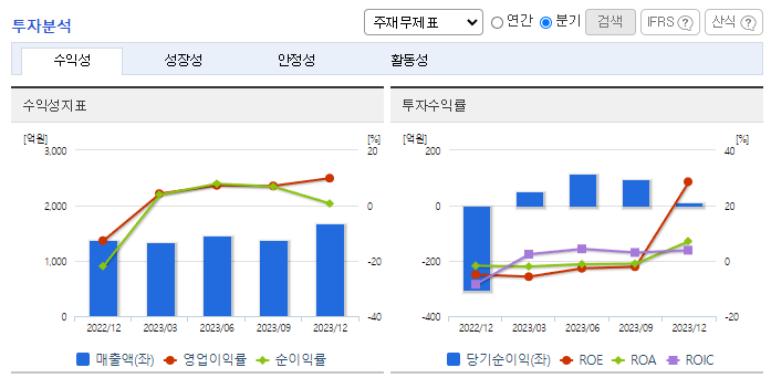 -2023년 12월 전년동기 대비 연결기준 매출액은 24.8% 증가, 영업이익은 3714.3% 증가, 당기순이익 흑자전환. 매출이 크게 늘었고, 판매비와 관리비비는 전년 대비 큰 폭으로 줄면서 수익성에 긍정적 영향을 미쳤음. 전동화, 자율주행, 커넥티비티 등 혁신적인 모빌리티 기술 구현 및 산업 패러다임 전환에 부합하는 신성장 동력 발굴을 통해 지속 가능성을 확보하는 데 주력해 나갈 것임.